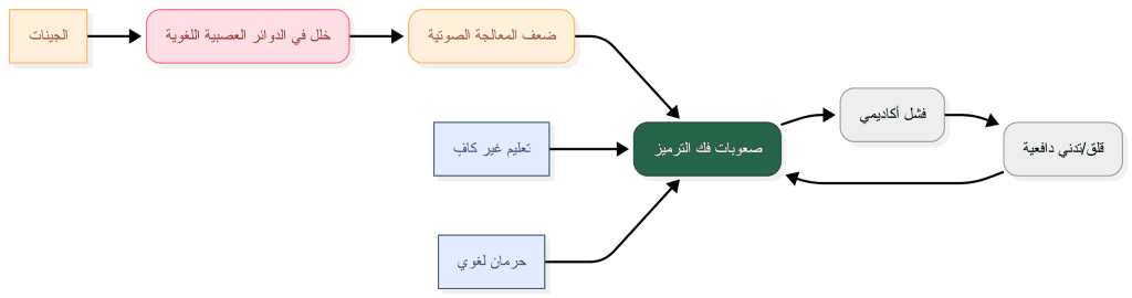 صعوبات القراءة الثانوية | ناتجة عن إعاقات أخرى (اضطراب اللغة التعبيرية، ADHD، إعاقة سمعية). |